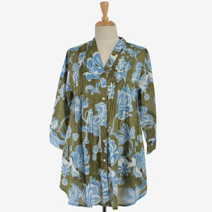 The Mozaic Palm Cove Shirt is a button-through long shirt crafted from luxuriously soft pure cotton. A flattering V-neckline and refined vertical pleating at the front and centre back create a sleek, lengthening silhouette. Finished with invisible pockets and 3/4 sleeves with buttoned cuffs, it blends effortless comfort with polished, practical style.